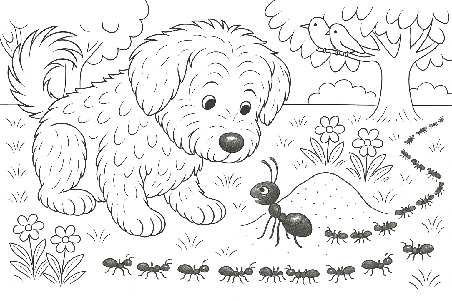 Ein fröhlicher Hund und eine Ameisenstraße.