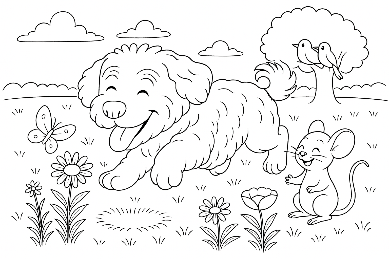 Ein fröhlicher Hund und eine kleine Maus auf einer Wiese mit Blumen.